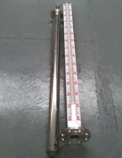 該頂裝式磁翻板液位計由本體(由上、下導(dǎo)管組成)、翻板箱(由紅、白雙色磁性小翻板組成)、浮子(由磁體、頂桿、浮筒組成)以及液位變送器等組成,其結(jié)構(gòu)如圖所示。工作原理為:容器內(nèi)的浮筒(按不同介質(zhì)和壓力針對),在下導(dǎo)管中隨液面高度的變化而上下浮動并通過頂桿使磁體在上導(dǎo)管內(nèi)上下移動,促使本體外的翻板翻動并用紅、白顏色來指示液面高度,同時液位變送器將液位信號傳送至控制中心進行液位指示和控制,也可通過計算機進行集中監(jiān)控。