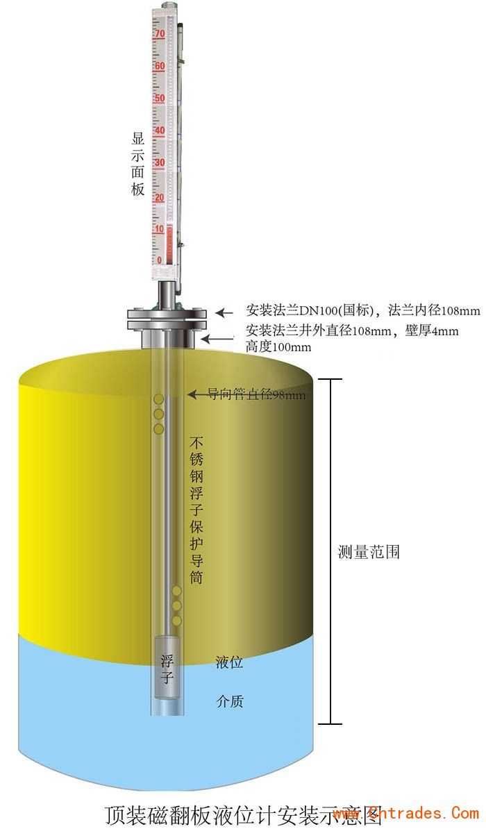 1、 在容器不適宜側(cè)面開孔及容器周圍空間很少時,可在容器上部或下部安裝本形式液位計